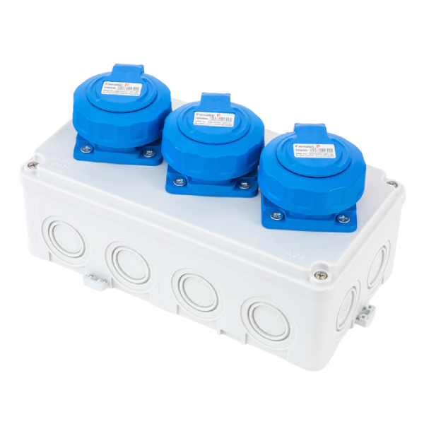 Cutia este echipată cu 3 prize Schuko albastre de 230V, precablate, și oferă grad de protecție IP67, ceea ce înseamnă că este complet etanșă la praf și protejată împotriva imersiunii temporare în apă.